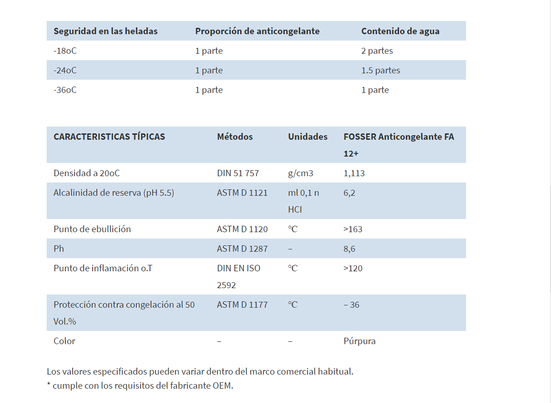 FOSSER Refrigerante FA 12+ mezclado con la cantidad correspondiente de agua se utiliza como líquido de refrigeración y transferencia de calor en motores de combustión, sin limitación ya sea hierro fundido, motores de aluminio o la combinación de metales y en sistemas de refrigeración de aluminio o aleaciones de cobre.